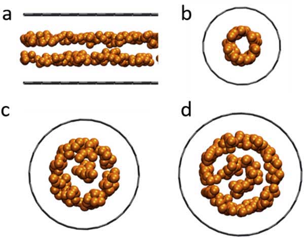 圖3:模擬結(jié)果獲得的氫良好堆積和取向,氫被限制在孔徑為0.66nm的狹縫形孔和孔徑為0.60nm,0.99nm和1.16nm的孔中,氫分子用單個金球表灰線表示活性炭原子。